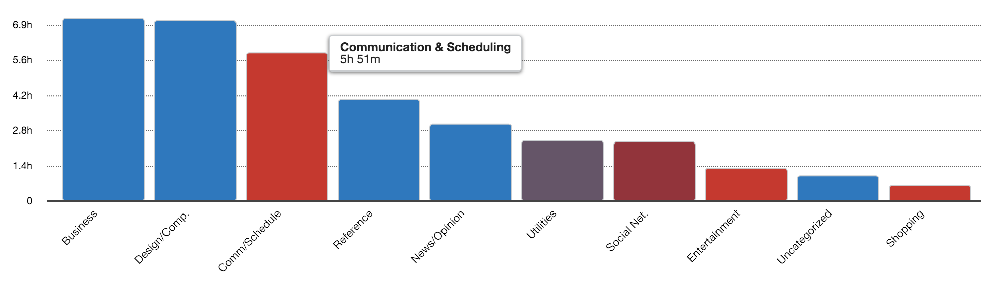 - After at least two weeks, choose a date at random and look at your hourly report. I’ll show two examples below. In the first one, email or “communication” is spread out throughout the day. That’s a problem. In the second image, look how concentrated communication is in the later part of the day, meaning email was not an interruption while doing other work earlier. In your own reports, look for patterns in terms of times of day when you could be more productive if only you were not getting sucked into email.